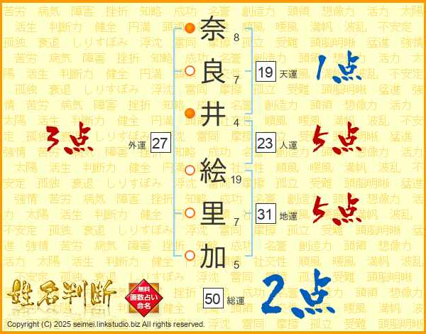 奈(8画)良(7画)井(4画) 絵(19画)里(7画)加(5画)