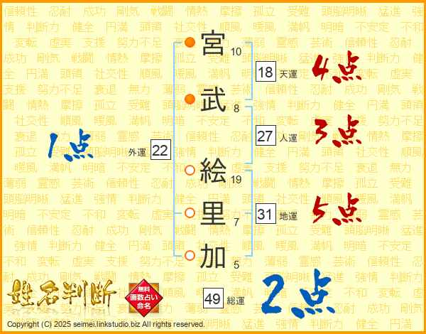 宮(10画)武(8画) 絵(19画)里(7画)加(5画)