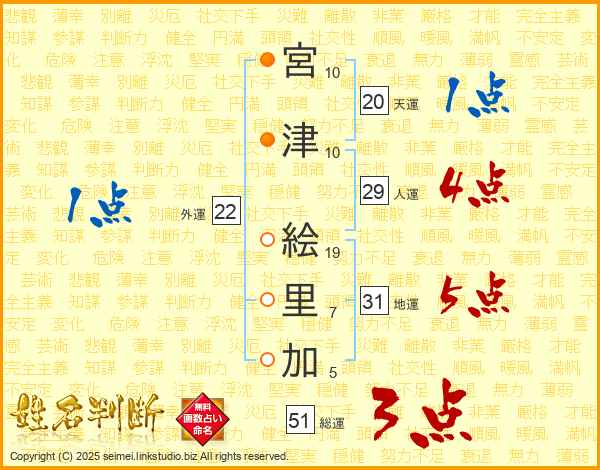 宮(10画)津(10画) 絵(19画)里(7画)加(5画)