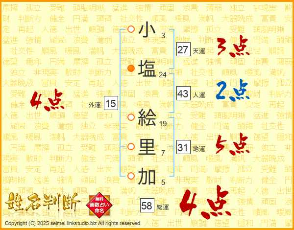 小(3画)塩(24画) 絵(19画)里(7画)加(5画)