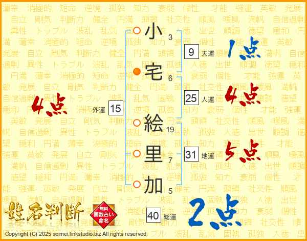 小(3画)宅(6画) 絵(19画)里(7画)加(5画)