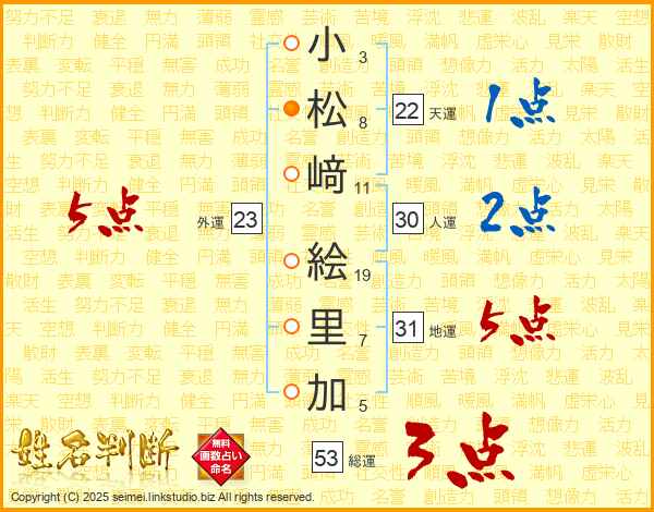 小(3画)松(8画)﨑(11画) 絵(19画)里(7画)加(5画)