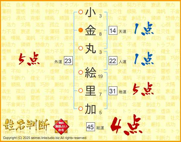 小(3画)金(8画)丸(3画) 絵(19画)里(7画)加(5画)
