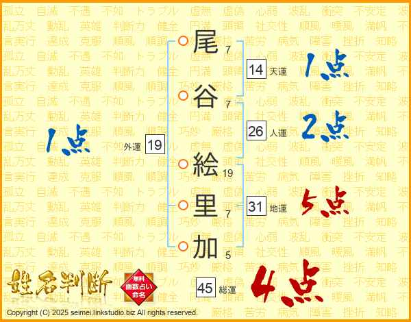 尾(7画)谷(7画) 絵(19画)里(7画)加(5画)