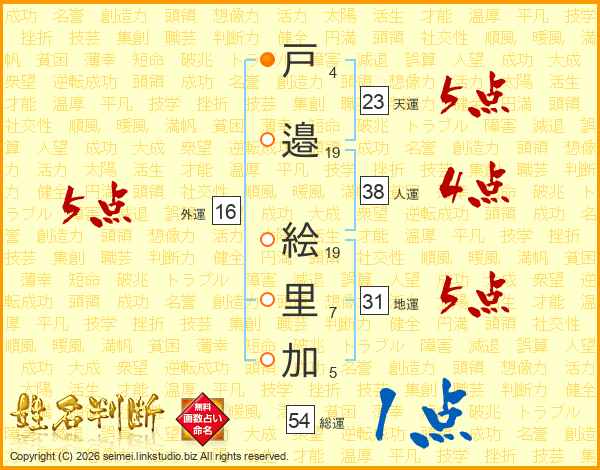 戸(4画)邉(19画) 絵(19画)里(7画)加(5画)