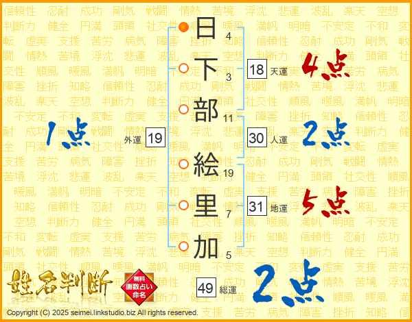 日(4画)下(3画)部(11画) 絵(19画)里(7画)加(5画)