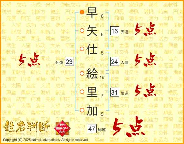早(6画)矢(5画)仕(5画) 絵(19画)里(7画)加(5画)