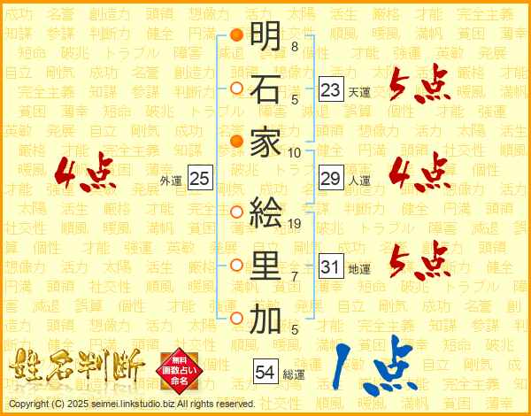 明(8画)石(5画)家(10画)  絵(19画)里(7画)加(5画)