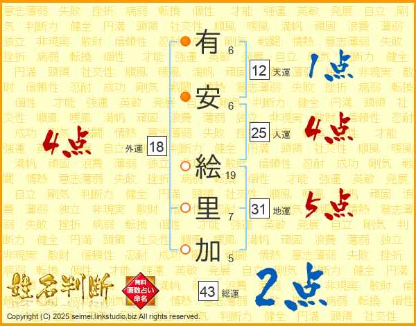 有(6画)安(6画) 絵(19画)里(7画)加(5画)