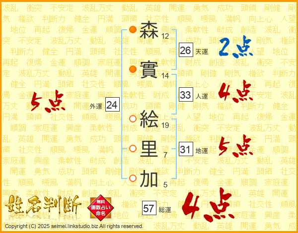 森(12画)實(14画) 絵(19画)里(7画)加(5画)