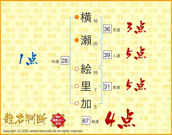 横瀬絵里加さんの総運は67画の4点!