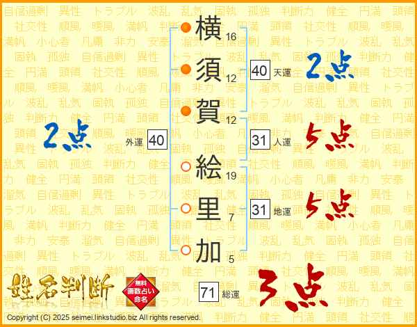 横(16画)須(12画)賀(12画) 絵(19画)里(7画)加(5画)