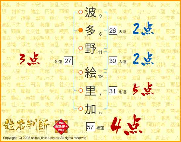 波(9画)多(6画)野(11画) 絵(19画)里(7画)加(5画)