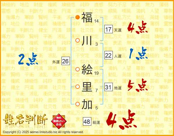 福(14画)川(3画) 絵(19画)里(7画)加(5画)