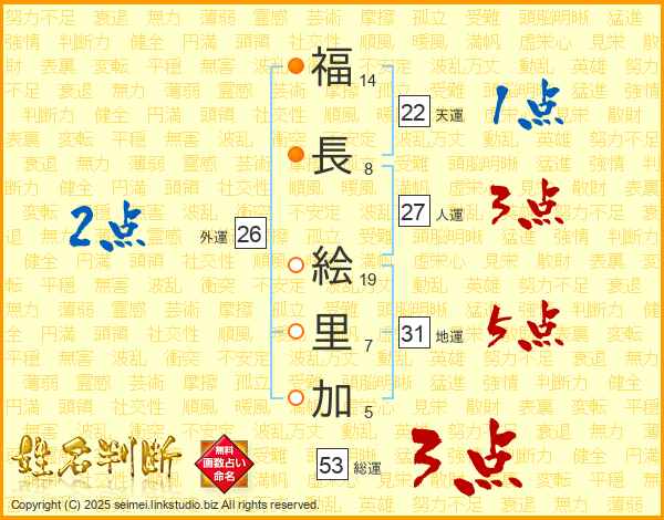 福(14画)長(8画) 絵(19画)里(7画)加(5画)