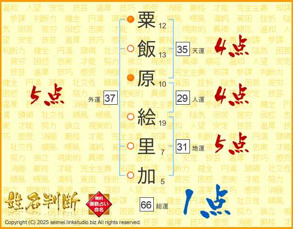 粟(12画)飯(13画)原(10画) 絵(19画)里(7画)加(5画)