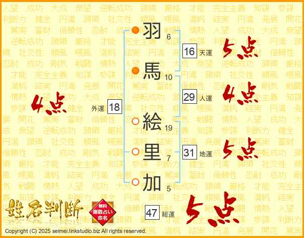 羽(6画)馬(10画) 絵(19画)里(7画)加(5画)