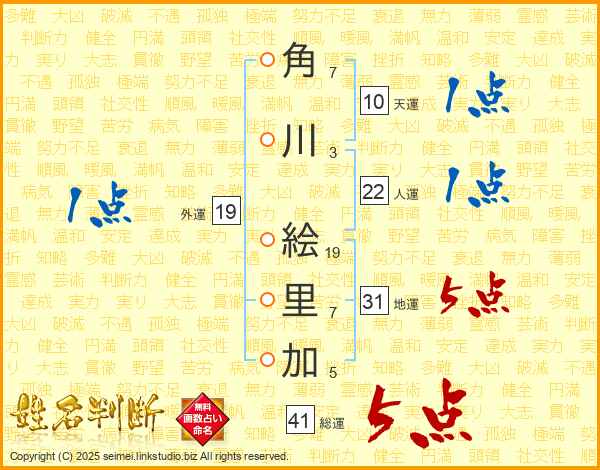 角(7画)川(3画) 絵(19画)里(7画)加(5画)
