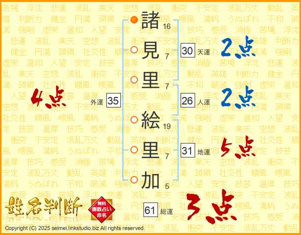 諸(16画)見(7画)里(7画) 絵(19画)里(7画)加(5画)