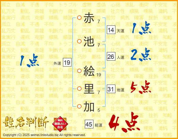 赤(7画)池(7画) 絵(19画)里(7画)加(5画)