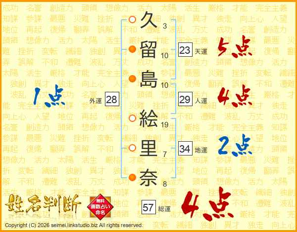 久(3画)留(10画)島(10画) 絵(19画)里(7画)奈(8画)
