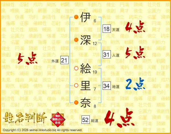 伊(6画)深(12画) 絵(19画)里(7画)奈(8画)