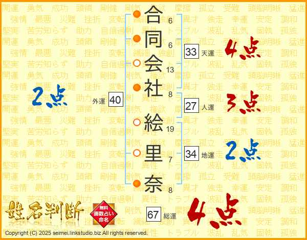 合(6画)同(6画)会(13画)社(8画) 絵(19画)里(7画)奈(8画)