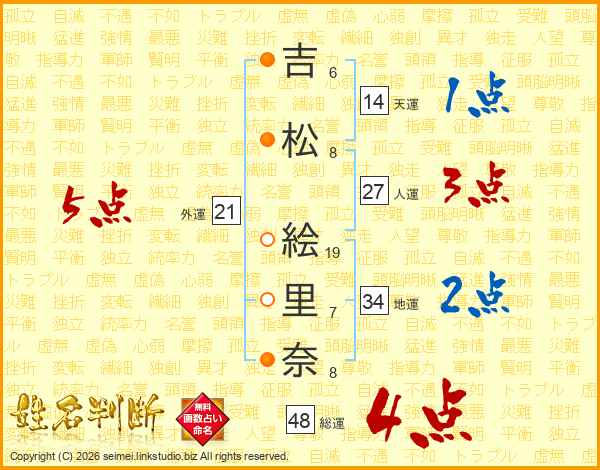 吉(6画)松(8画) 絵(19画)里(7画)奈(8画)