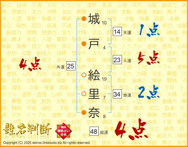 城(10画)戸(4画) 絵(19画)里(7画)奈(8画)