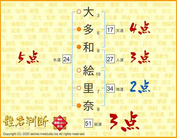 大(3画)多(6画)和(8画) 絵(19画)里(7画)奈(8画)
