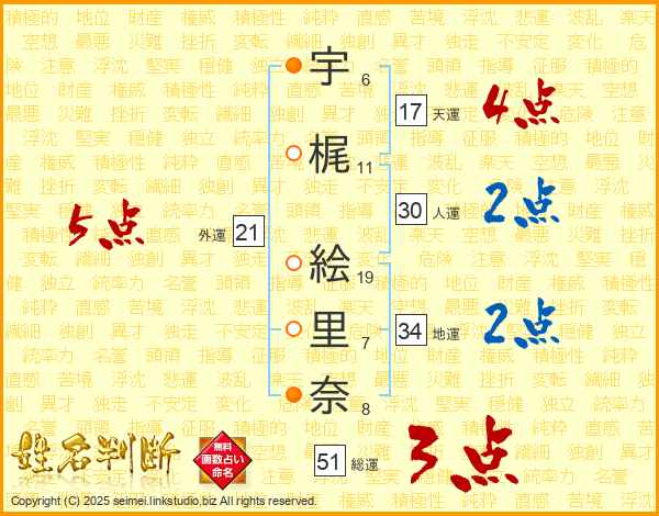宇(6画)梶(11画) 絵(19画)里(7画)奈(8画)