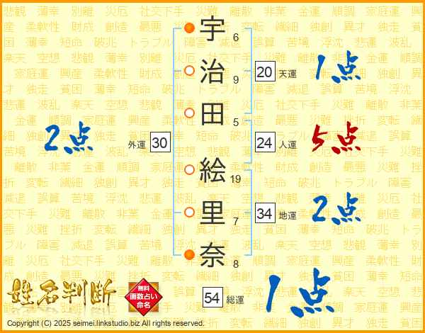 宇(6画)治(9画)田(5画) 絵(19画)里(7画)奈(8画)
