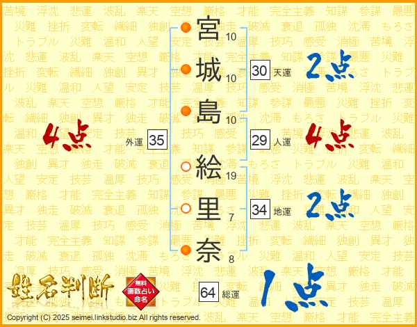 宮(10画)城(10画)島(10画) 絵(19画)里(7画)奈(8画)