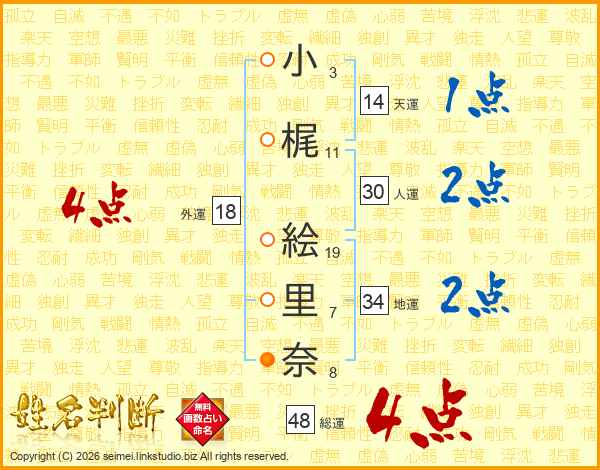 小(3画)梶(11画) 絵(19画)里(7画)奈(8画)
