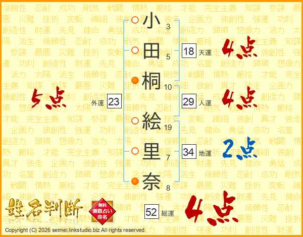 小(3画)田(5画)桐(10画) 絵(19画)里(7画)奈(8画)