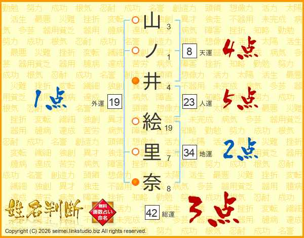 山(3画)ノ(1画)井(4画) 絵(19画)里(7画)奈(8画)