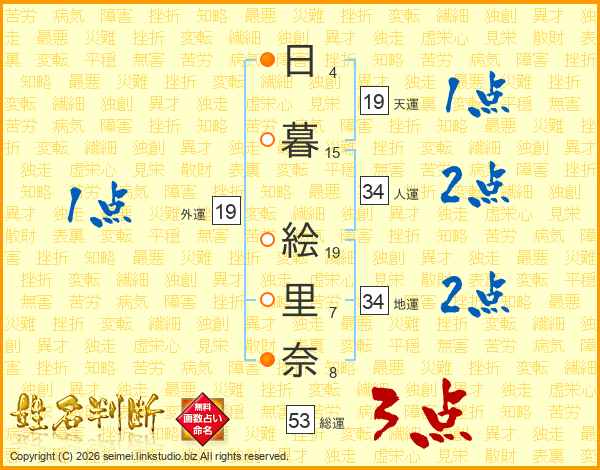 日(4画)暮(15画) 絵(19画)里(7画)奈(8画)