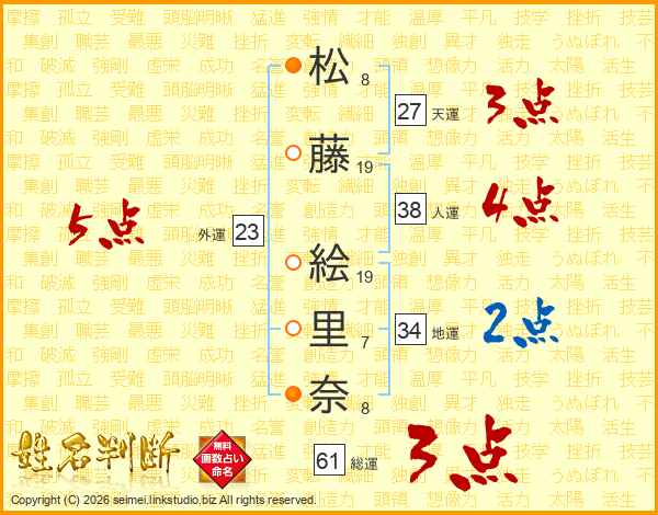 松(8画)藤(19画) 絵(19画)里(7画)奈(8画)