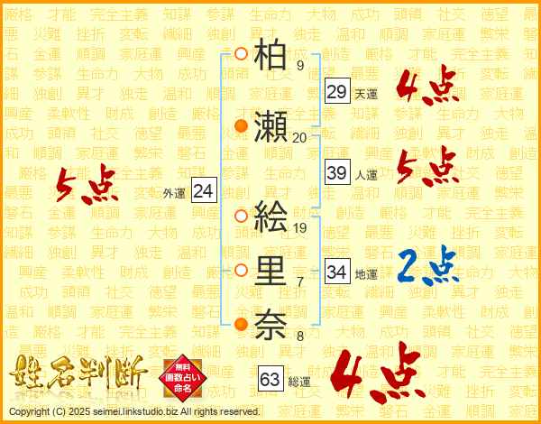 柏(9画)瀬(20画) 絵(19画)里(7画)奈(8画)