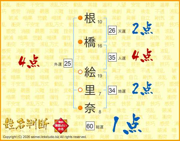 根(10画)橋(16画) 絵(19画)里(7画)奈(8画)