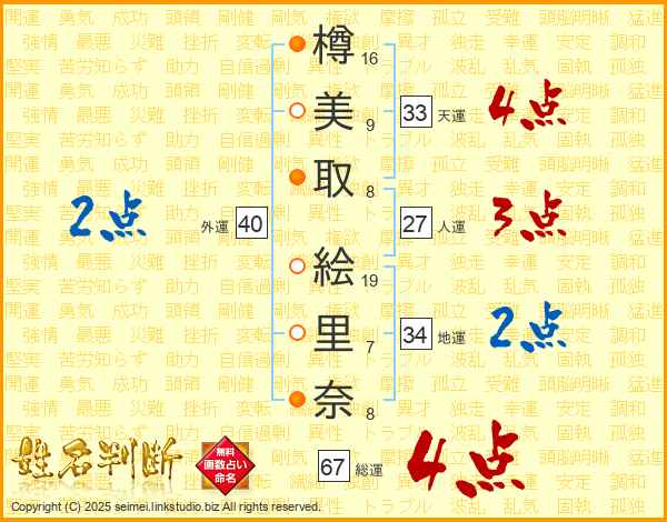 樽美取絵里奈さんの総運は67画の4点!