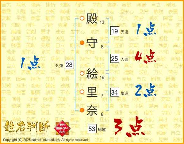 殿(13画)守(6画) 絵(19画)里(7画)奈(8画)