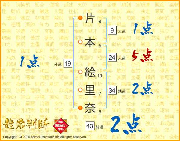 片(4画)本(5画) 絵(19画)里(7画)奈(8画)
