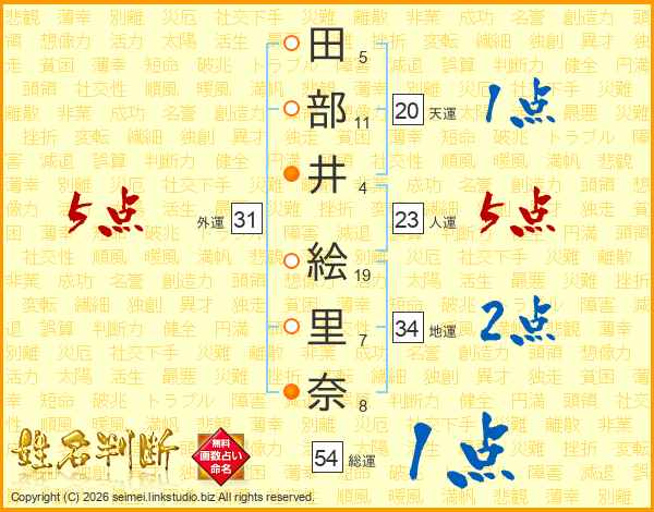 田(5画)部(11画)井(4画) 絵(19画)里(7画)奈(8画)