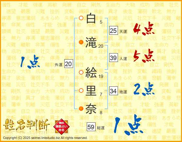 白(5画)滝(20画) 絵(19画)里(7画)奈(8画)