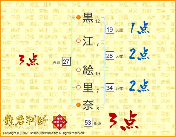 黒(12画)江(7画) 絵(19画)里(7画)奈(8画)