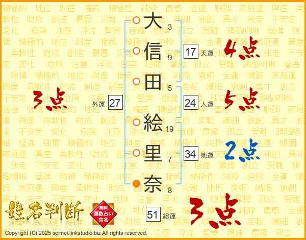 大(3画)信(9画)田(5画) 絵(19画)里(7画)奈(8画)