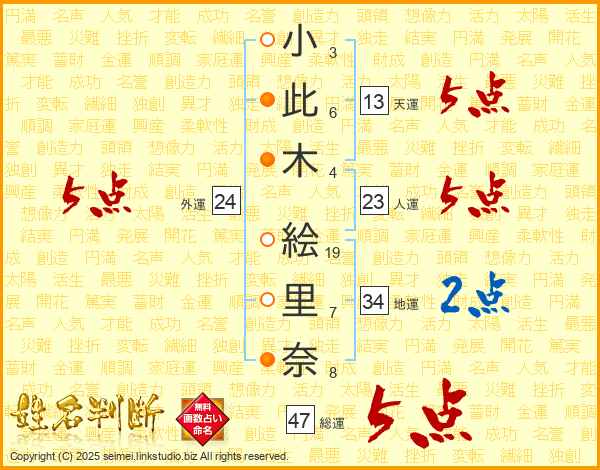 小(3画)此(6画)木(4画) 絵(19画)里(7画)奈(8画)