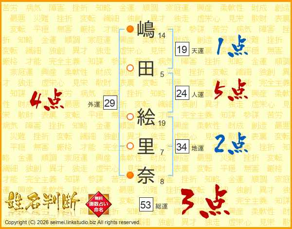 嶋(14画)田(5画) 絵(19画)里(7画)奈(8画)