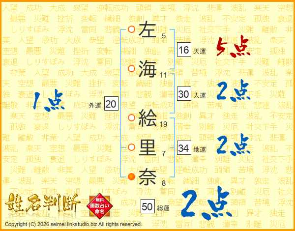 左(5画)海(11画) 絵(19画)里(7画)奈(8画)